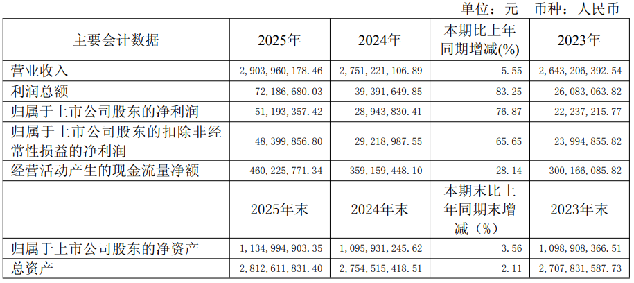 2025年,一鸣食品实现营业收入29.04亿元,同比增长5.55%;实现归属于上市公司股东的净利润5119.34万元,同比增长76.87%。